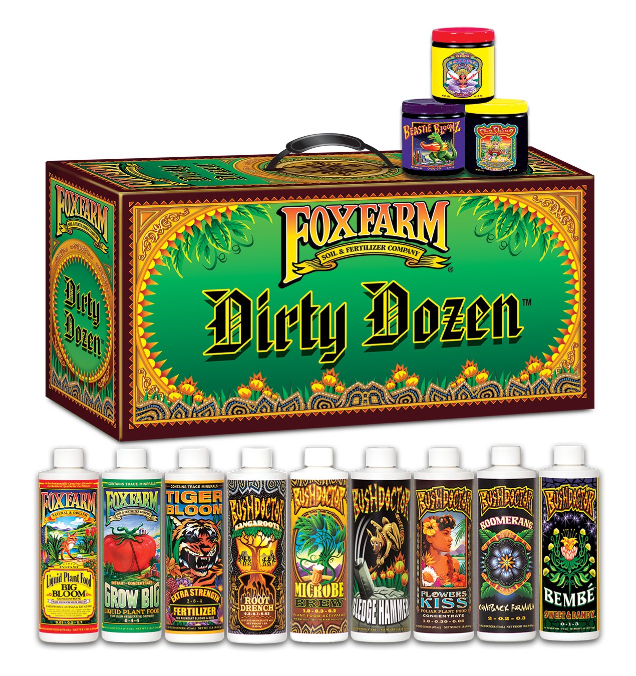 Details: Foxfarm Dirty Dozen starter kit includes nine 1-pint bottles of plant food and three 6-oz bottles of soluble fertilizer.