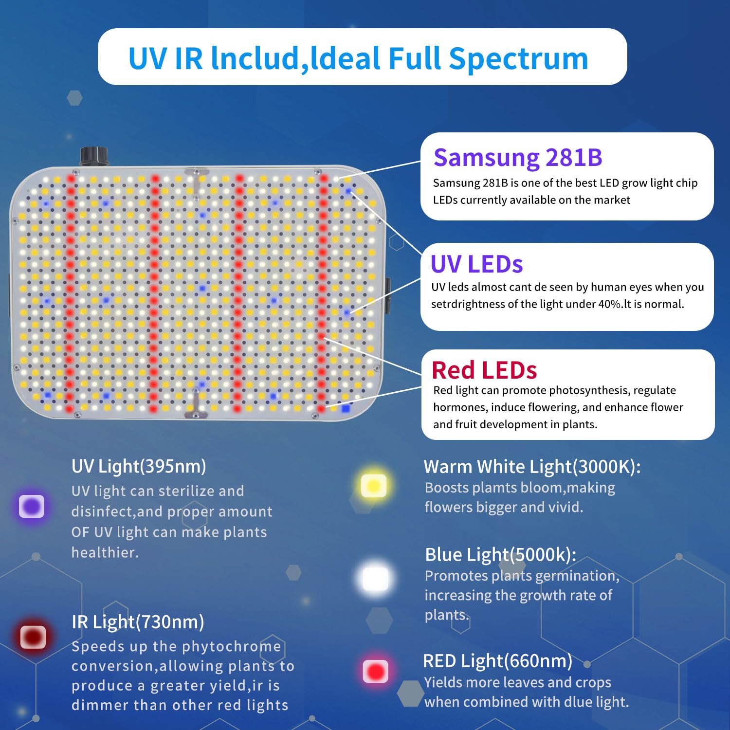 - Full spectrum: the light include red,blue,yellow,white,and so on etc. which is similar to the sunshine,ideal for all kinds of indoor plants veg and flower at all growth stages.